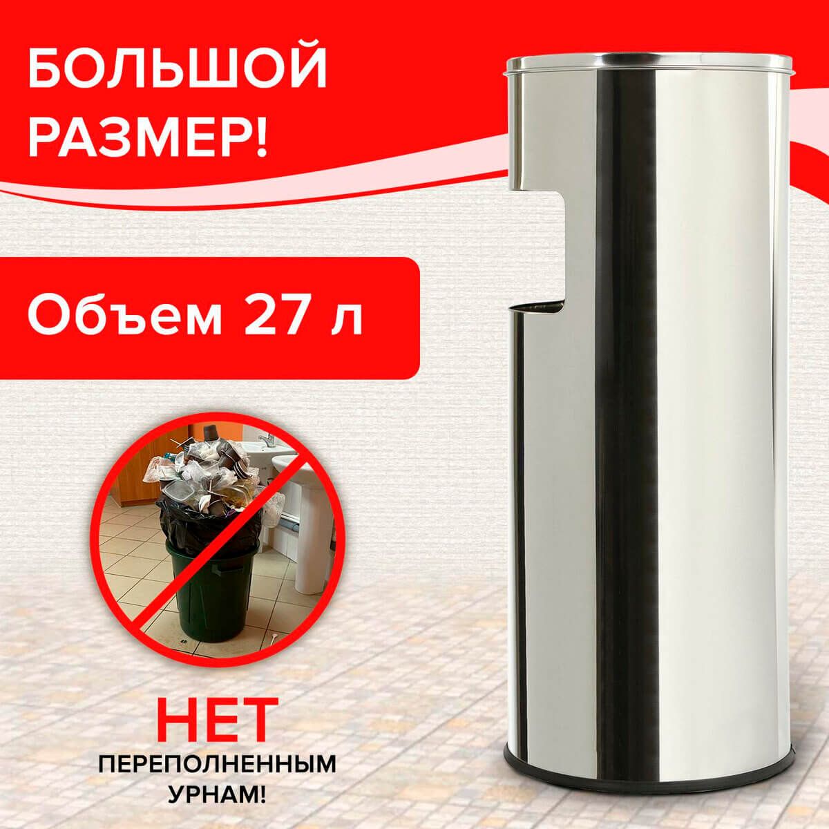 Эта урна изготовлена из зеркальной нержавеющей стали, что придает ей не только надежность, но и изысканный внешний вид. С её вместительностью в 27 литров она готова принимать на себя ответственность за поддержание чистоты как внутри помещения, так и на входе в здание.